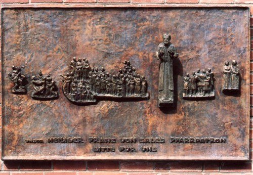 Am 20. August 1994 fand die Einsegnung des Sales-Reliefs an der Außenwand der Kirche zur Artilleriestraße hin statt. Die Bronze-Arbeit stammt von dem Bildhauer Hans Scherl † aus Wittlich (Eifel). Mit diesem Relief hat sich die Gemeinde den lang gehegten Wunsch erfüllt, der Kirche ein Gesicht und dem Pfarrpatron ein Bild zu geben. Das Relief, angebracht auf eine Bronze-Platte, zeigt den hl. Franz von Sales als Prediger, der den Menschen einladend seine Hände entgegenstreckt. Ganz rechts vom Heiligen haben zwei Frauen ihren Platz gefunden, denen Franz von Sales besonders nahe stand – zunächst Madame de Charmoisy, eine junge adelige Frau, der er sein bekanntestes Buch widmete, die „Philothea“ (Gottesfreundin), eine Einführung in das religiöse Leben – dann die hl. Johanna Franziska de Chantal, mit der er zusammen den Frauenorden von der Heimsuchung Mariens gründete.